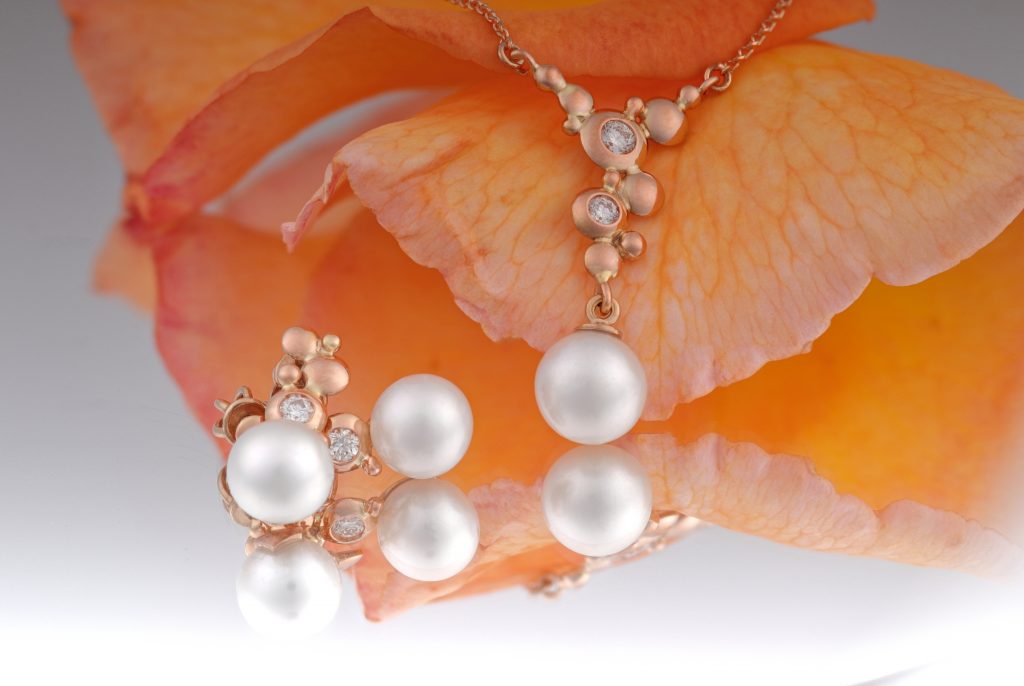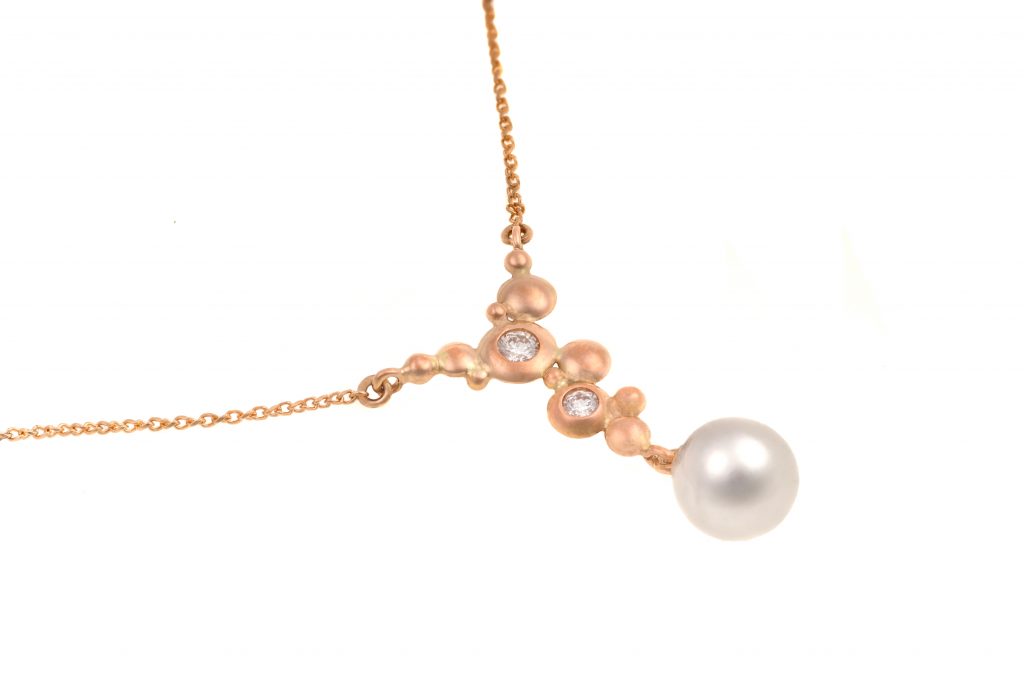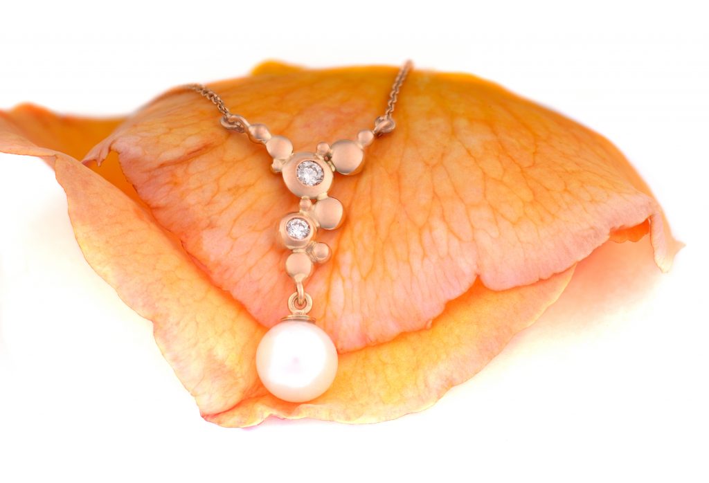 Nadčasový náhrdelník z červeného zlata s perlou a přírodními diamanty. Jemný design podtrhuje ženskost a přirozenou eleganci, díky čemuž je ideální pro každodenní nošení i výjimečné příležitosti.