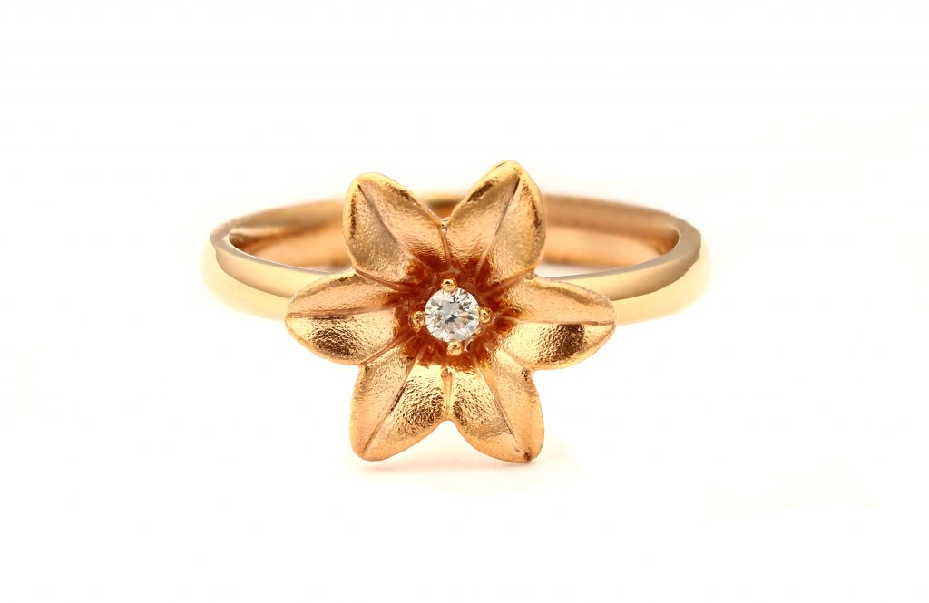 Jemný zlatý prsten s plasticky ztvárněným květem a třpytivým přírodním diamantem uprostřed. Precizně propracované detaily okvětních lístků dodávají šperku přirozenou lehkost a eleganci. Prsten působí něžně, ale přitom výrazně – krásně doplňuje náušnice a náhrdelník ze stejné kolekce.