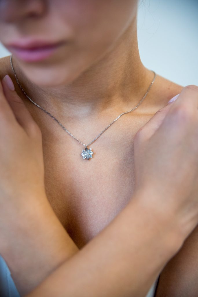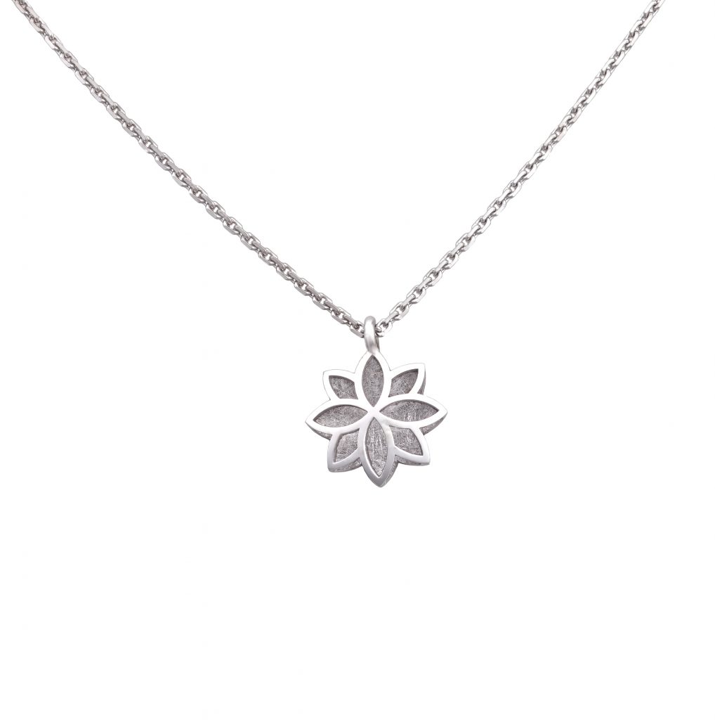 Tento něžný náhrdelník zdobí detailně zpracovaný přívěsek ve tvaru květu s jemným plastickým efektem. Design působí svěže a nadčasově, takže se hodí pro každodenní nošení i jako doplněk k elegantnímu outfitu.